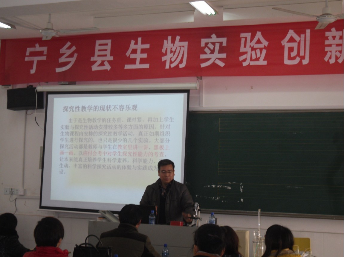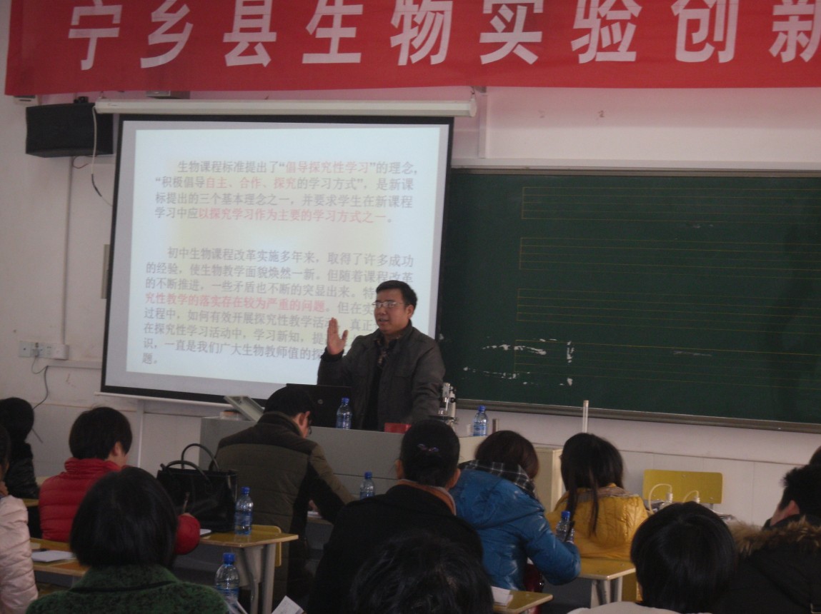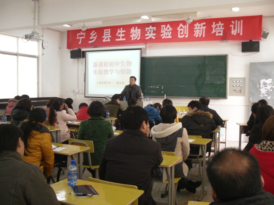 名师引领科技创新与学科教学整合: 长沙市科技创新特色工作室名师陈水章老师受邀参加宁乡县生物实验创新培训班授课 2013年12月20日,宁乡县教育局教学仪器站,为提高全县生物教师实验教学的水平,培养生物教师实验创新的能力与意识,在宁乡县第十三中学举办“生物实验教学创新培训班”,特邀请名师陈水章老师为与会的生物教师授课,陈水章老师通过对《初中生物学新课程标准》关于实验教学的解读,《初中生物学》新教材中关于实验教学的设计与安排的解读,并利用大量的实验创新的案例,在讲课中,陈老师还展示了他多年在科技创新与生物学学科教学整合方面的成果,使与会的全体生物教师在初中生实验教学与实验创新方面,从整体上有了新的认识,启迪并拓展了他们的思维,深受大家的欢迎与高度的评价,充分发挥了名师引领与带动的作用。