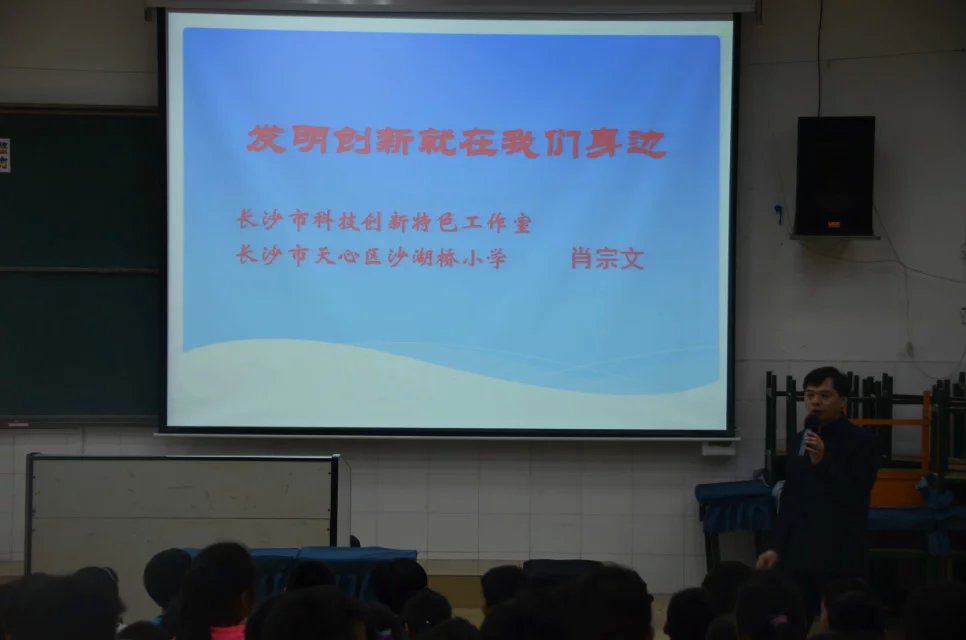 为了引导学生关注现代科技新发展和新成果,积极参与科技创新实践和体验活动,培养学生创新思维和实践探究能力,国防科大附属小学开展了第13届“动手动脑玩科学”为主题的科技节活动。4月8日下午长沙市科技创新特色工作室首席名师肖宗文老师,应邀为该校全体师生讲了一场精彩的小发明专题讲座。