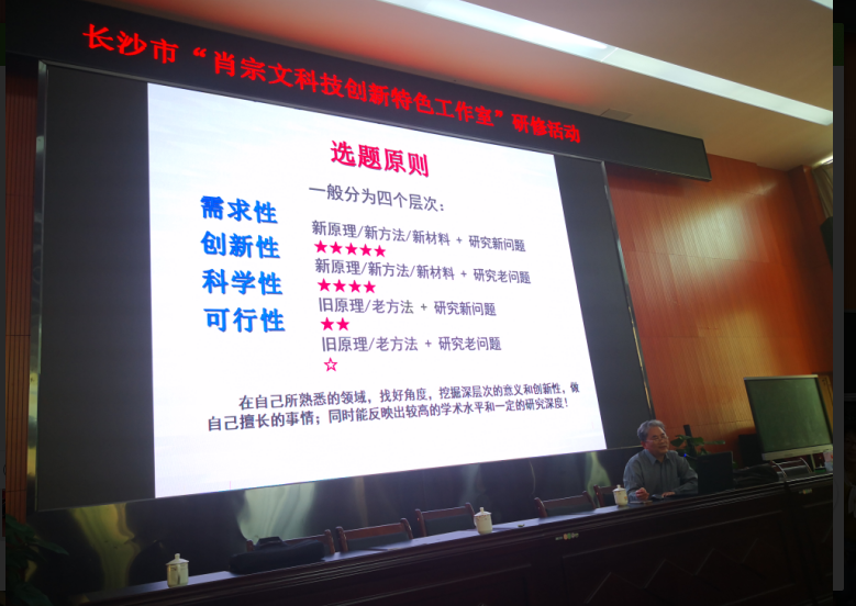 紧接着长沙市教育局教师工作处陈利群处长对肖宗文科技创新特色工作室一直专注于科技创新教师队伍的专业成长开展研修活动给予肯定,并对工作室提出三点希望:第一是希望工作室能够成为科技骨干老师成长的基地,能够培养出科技创新教育的名师。第二希望工作室通过研训能够出成效,带领长沙市科技创新教育学科的发展。第三希望工作室团队通过教学实践,通过研究,通过辐射能够出一批教学成果。能够成为科技创新教育改革的实践基地,成为推动教育实践及教学改革的排头兵。