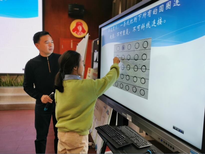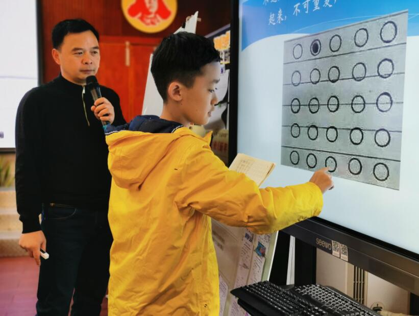 肖老师首先出示画有25个点的图,并出示题目要求“不过黑点,一条线把剩下所有的圆圈连起来,不可重复,不可斜线连接。”通过这个题目的解答,让学生明白在解决问题时要打破框框思考问题,不要拘束于框框内,搞发明创新就要跳出框框思考问题。