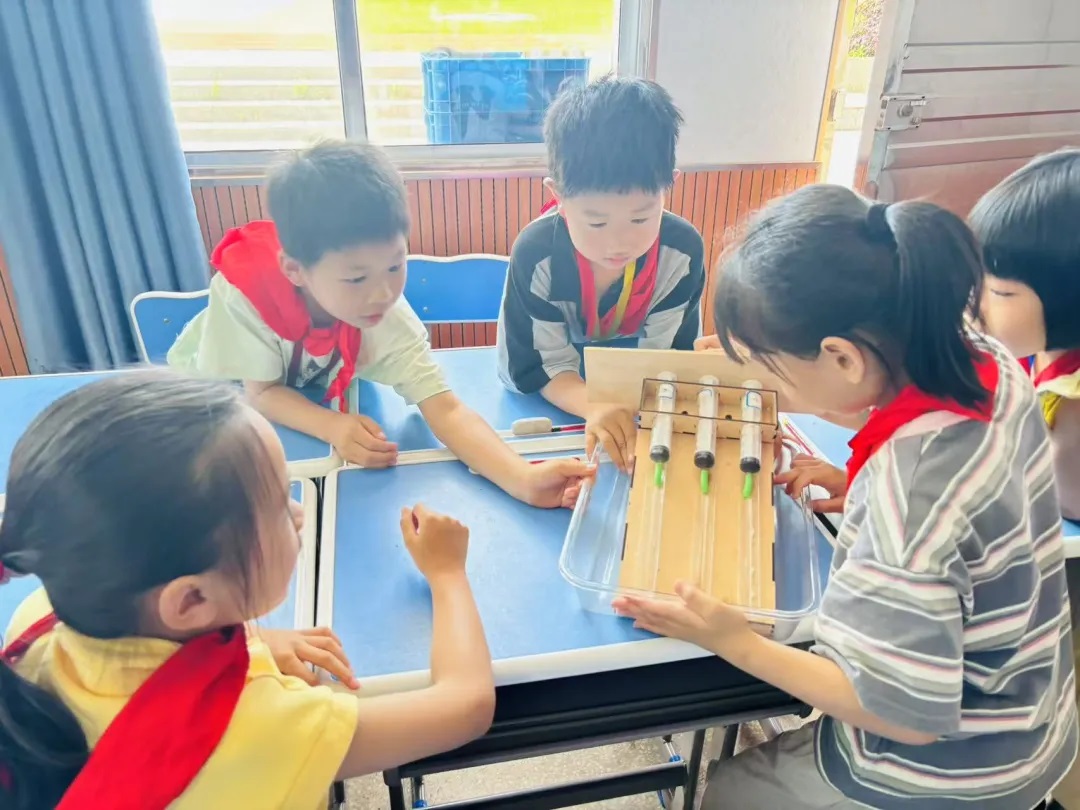 与此同时,科学组研训活动在录播室同步展开,第一堂展示课例《哪个流动得快》,文雅琴老师以流体实验整体切入课堂,让孩子用自制斜坡装置对比水、油、蜂蜜流速,借体育竞技经验制定公平规则,引发“黏度如何影响流速”的探究需求。学生通过实验得出“黏度越大流动越慢”的结论,更在设计蜂蜜提取器时将知识创生为生活应用。课堂以整建构认知,以引激活思维,以创实现迁移,让科学素养在实践中生长。